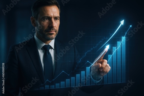 Businessman points to a graph showing upward trend.