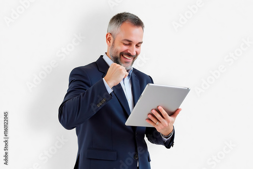 businessman, business, suit, computer, laptop, person, people, holding, photogenic, tablet, work, technology, standing, office, executive, professional, smiling, cyberspace, looking, attaching, notebook, manager, corporate, men at work, smile