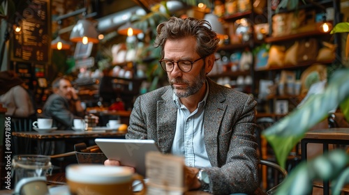 Businessman sitting in a trendy coffee shop, reading the latest business news on his tablet, with the café's vibrant atmosphere providing the perfect work setting realistic photo, high resolution ,