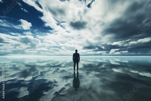 Businessman standing on a reflective water surface with cloudy sky reflecting on it, creating a surreal and contemplative atmosphere