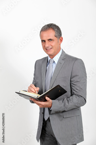 business, businessman, salesman, professional, agenda, pda, man, mature, smiling, manager, director, boss, employee, men at work, white background, standing, photogenic, attractive, grey hair, 40s, caucasian, suit, attaching, office worker, indoor