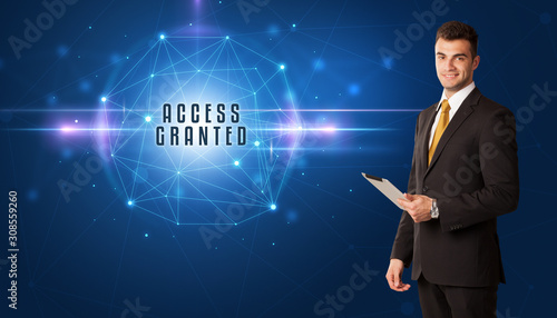 Businessman thinking about security solutions with ACCESS GRANTED inscription