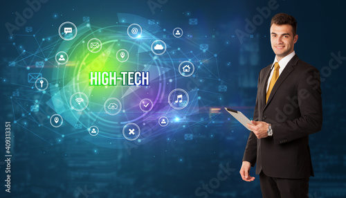 Businessman thinking in front of technology related icons and HIGH-TECH inscription, modern technology concept