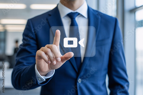 Businessman touching virtual video call button digital communication interface concept