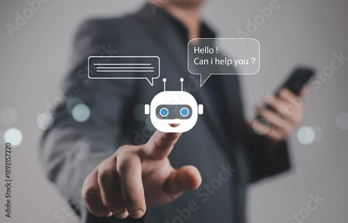 Businessman using AI chatbot interface on virtual screen, artificial intelligence customer service concept, digital assistant, online support, smart technology, automation communication innovation.
