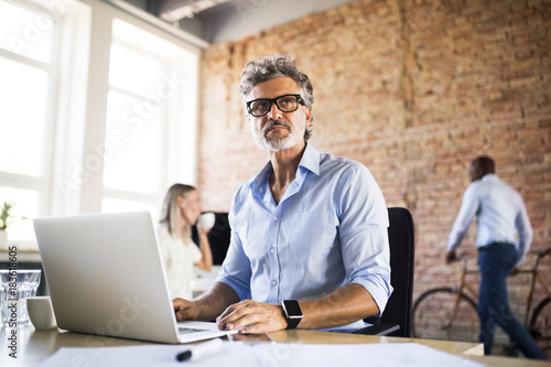 businessman, laptop, office, colleague, background, desk, workplace, computer, business, people, table, brick wall, wall, project, information technology, wi-fi, sceptical, thinking, brick, wireless, wearable, caucasian, three, mature, mid, adult, young, programmer, developer, suspicious, contemplation, accessibility, connection, online, cyberspace, job, pensive, sitting, working, goggles