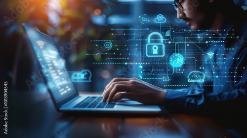Businessman Using Laptop with Digital Padlock Symbol, Secure Internet Technology Networking, Cloud Computing, Cybersecurity, and Data Management for Digital Privacy and Business Protection