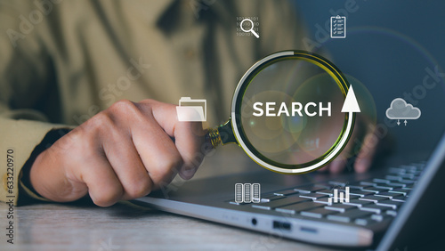 Businessman using magnifying glass search information networking with tablet. Job search, find a job, job interview. Data Search Technology Search Engine Optimization.