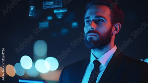 businessman, tablet, futuristic, transparent, datum, floating, air, technology, digital, screen, office, desk, suit, attaching, night, city, light, display, information, statistic, financial, analysis, research, innovation, corporate, professional, modern, sleek