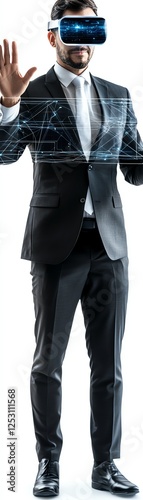 Businessman wearing VR headset interacting with virtual interface.