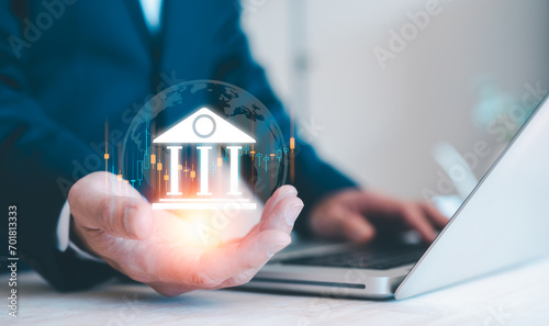 businessman working in modern office and holding virtual glob financial icons in finance business investment strategy and banking solution network concept