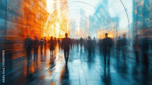 businesspeople in a modern trade show environment captured in blurred motion, conveying a sense of speed and activity amidst contemporary architectural elements