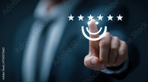 businessperson, rating, smile, graphic, interaction, touch screen, feedback, positive, glowing, modern, technology, digital, client, service, excellent, satisfaction, review, happy, business, success, interface, hand, finger, gesture, input, click, virtual, projection, overlay, dark, background, suit, light, white, star, 5, life events, solution, growth