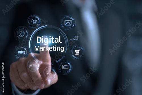 Businessperson interacts with a digital interface displaying "Digital Marketing" and various related icons