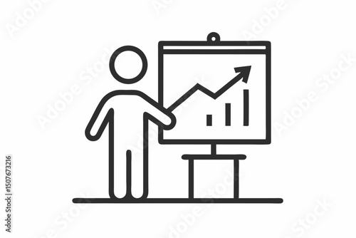 business, presentation, graph, chart, growth, success, progress, datum, statistic, increase, improvement, development, strategy, planning, meeting, speaker, presenter, person, icon, symbol, infographic, line art, black-and-white, simple, minimalist, vector, illustration, finance, marketing, sale, economy, report, communication, concept