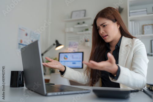 frustration, overwhelmed, stress, stressed, businesswoman, woman, laptop, computer, problem, office, desk, technology, error, deadline, difficulty, confuse, confused, unhappy, worried, men at work, working, workplace, business, entrepreneur, professional, manager, employee, remote, work, online, cyberspace, bankruptcy, system, modern, serious, young, adult, asian, hand, gesticulate, finance, datum, chart, analysis, financial