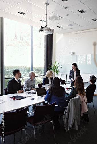 Businesswoman interacting to female colleague sitting with coworkers at conference table during meeting in board room