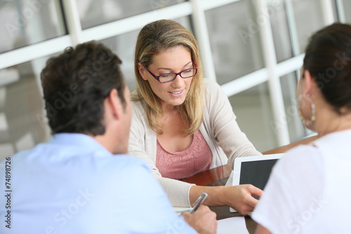 Businesswoman meeting with couple to sign financial contract