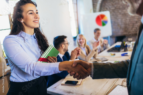 Businesswoman receiving award from businessman in front of business professionals, applauding at business seminar in office building