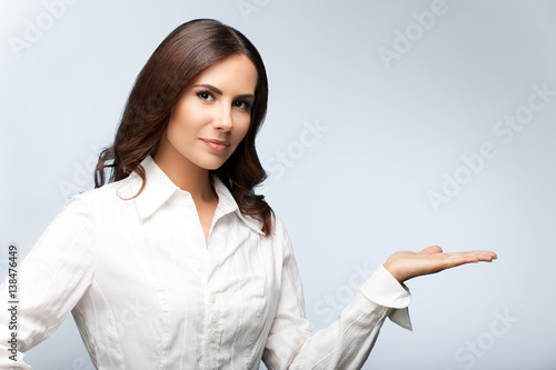 show, showing, something, copy, space, blank, area, hand, signs, arm, gesture, success, successful, positive, business, woman, woman, people, executive, person, businessperson, businesswoman, businesswoman, employee, grey, grey, background, happy, smiling, portrait, men at work, secretary, manager, office, personnel, broker, girl, brunette, formal, wear, style, white, latin, hispanic