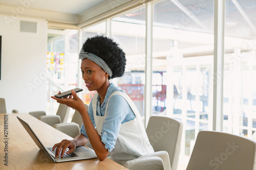 Businesswoman talking on mobile phone while working on laptop in the conference room