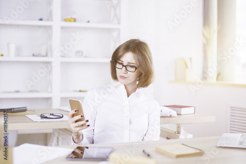woman, smartphone, using, office, bright, daylight, mobile phone, cellular, wooden, desktop, desk, top, table, messy, tablet, laptop, technology, tech, device, contraption, message, texting, corporate, goggles, portrait, attractive, european, white, caucasian, lifestyle, smiling, background, connection, girl, businesswoman, communication, holding, phone, smart, young, business, professional, adult, isolated, tool, item, paperwork, sitting