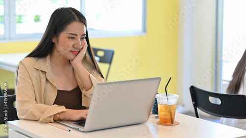 Businesswoman working with laptop on the table in co-working space
