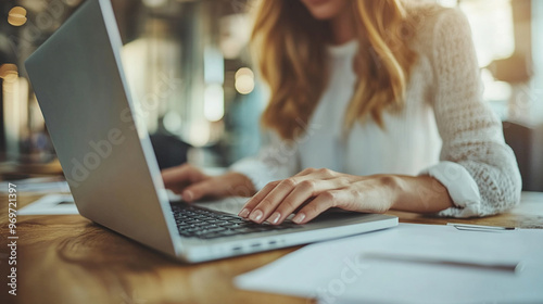 businesswoman's hands typing on a laptop keyboard. Focus is on her fingers as she works on a modern computer in a professional office environment, representing productivity and technology