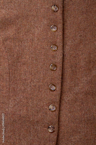 Buttons on brown woolen clothes. Close up column of buttons, vertical view.