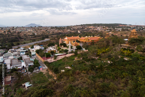 Buu Son Buddhist Temple near the Poshanu or Po Sahu Inu Cham Tower in Phan Thiet city in Vietnam, top view, aerial view