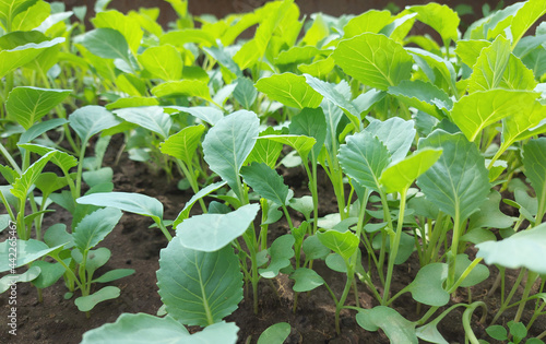 cabbage seedlings growing in a greenhouse. vegetable garden plant beds agricultural crops, gardening, small green leaves.