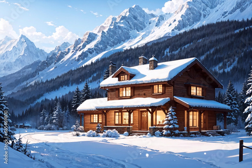 cabin in winter, snowy landscape, cabin in the snowy mountains