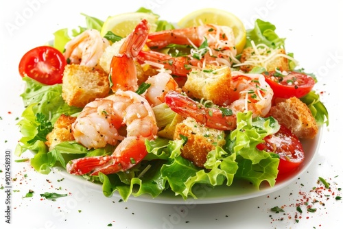 caesar, salad, salat, bar-b-q, tiger, shrimp, isolated, green, lettuce, grated, parmesan, cheese, crispy, crouton, generative, ai, illustration, roasted, king, shrimp, chicken, gold, crouton, epicure, vegetable, meal, garnish, dinner, fillet, lunch, dressing, cookery, garlic, romaine, grilled, seafood, food, eatery, plate, dish, delicious, plated, delivery, high