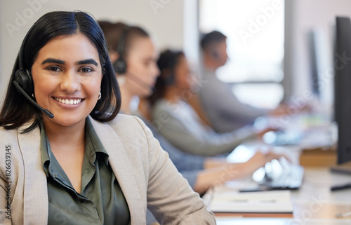 Call center, portrait and woman with headset, achievement and communication in workplace. Happy, technology and telemarketing agent in office for deal, consulting and customer service or support