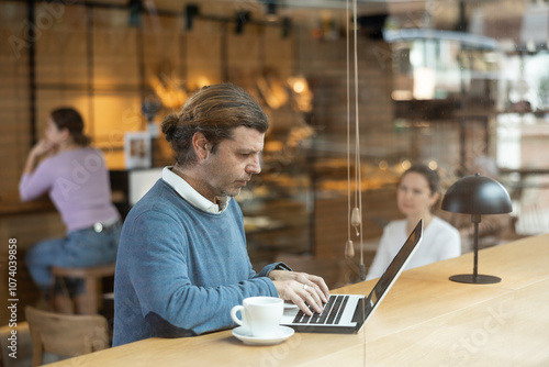 Calm caucasian man sitting in cafe diligently doing his work on laptop