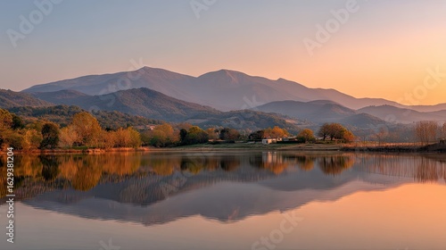Calm lake reflecting mountains at sunrise.