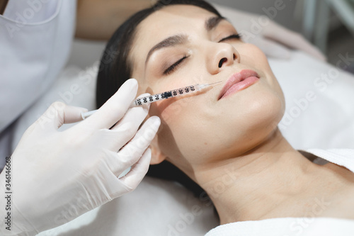 Calm peaceful young woman lying during botox injection process. Beautician in white gloves hold syringe at upper lip area. Doing injection careful and accurate.