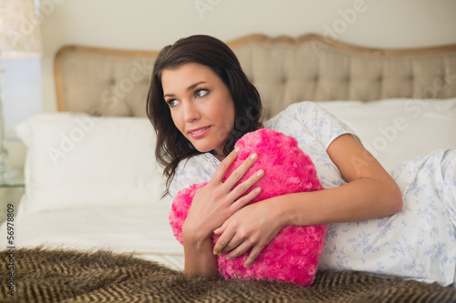Calm pretty brown haired woman hugging a heart shaped pillow