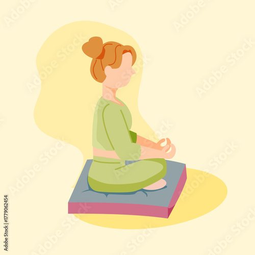 Calm woman meditating on soft mat in minimalist flat art. Soft pastel colors with smooth shading create peaceful atmosphere. Perfect for yoga, mindfulness, or wellness illustration projects.