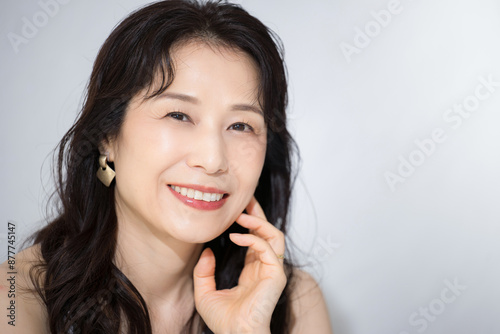 female, 50s, beauty, 40s, skin, looking up, beautiful, beautiful woman, moisturise, skincare, japanese, people, one person, healthy, upper body, white background, smiling, copy space, portrait, long hair, hair, hair care, perm, indoor, black hair, face, model, fair, pretty, lifestyle, middle, make-up, cute, cheek, touch, closeup, bright, pose, relaxed, stylish, indoor, grey background, big smile, woman, smile, communication