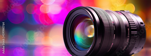 Camera lens with colorful background contrasting backgrounds. Generative Ai.