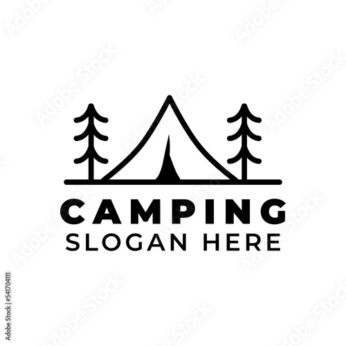 camping logo template with tent and pine tree image on isolated background