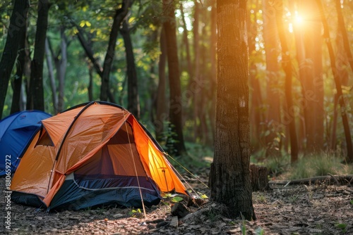 Camping tent campground in outdoor forest, nature background summer trip camp travel adventure vacation