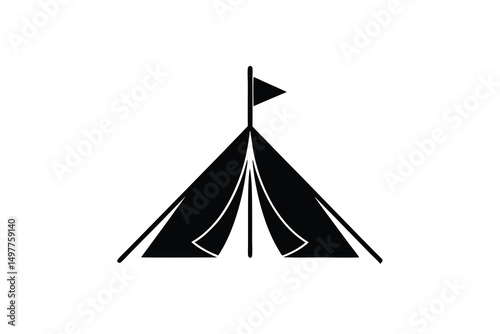 tent, camping, outdoors, adventure, travel, nature, silhouette, icon, symbol, graphic, design, black, white, simple, minimalist, illustration, vector, isolated, background, flag, peak, shelter, wilderness, expedition, tour tourism, recreation