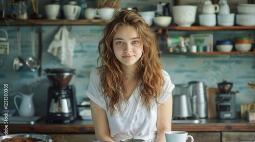 Candid portrait of a young woman enjoying coffee in a cozy kitchen lifestyle warm atmosphere natural light