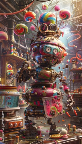 candy, robot, futuristic, shop, colourful, sweet, lollipop, machine, whimsical, fantasy, surreal, artwork, digital artwork, illustration, three-dimensional, science fiction, retro, vintage, quirky, playful, imagination, creativity, design, texture, detail, intricate, pattern, vibrant, bright, happy, fun, joy, sweet, treat, sugary, delicious, adorable, cute, charming, dream, wonder, art, style, aesthetic
