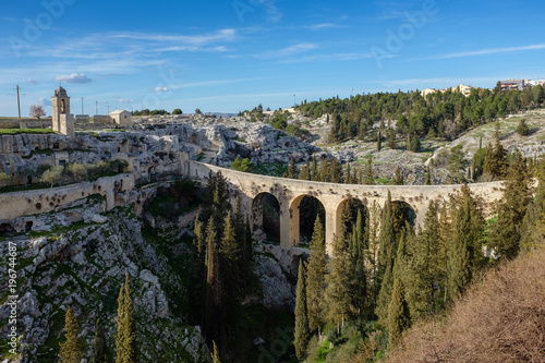Canyon of Gravina with the old aqueduct stone bridge. Apulia region, Italy.