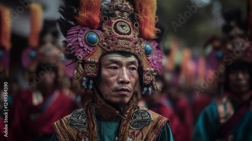 Cap Go Meh Festival (Tatung Parade) in Singkawang, Indonesia on February 12, 2025, colorful Tatung performers adorned with elaborate traditional costumes and intricate face paint