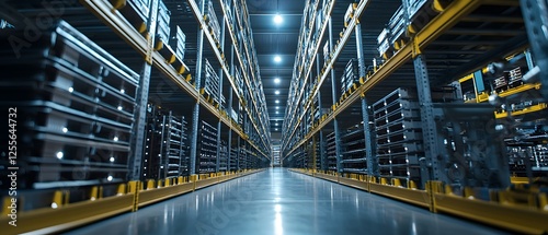 Capacity Shipping System, Warehouse Racks of Metal Components with Bright Lighting Enhancing Depth and Perspective