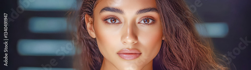 Captivating close-up of a young woman with expressive eyes and radiant skin